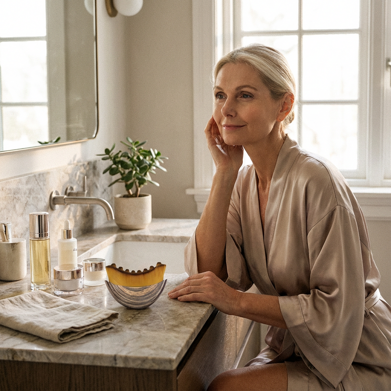 A refined facial massage tool designed to support lymphatic drainage, reduce facial puffiness, and encourage firmer-looking skin — gently, naturally, and consistently.